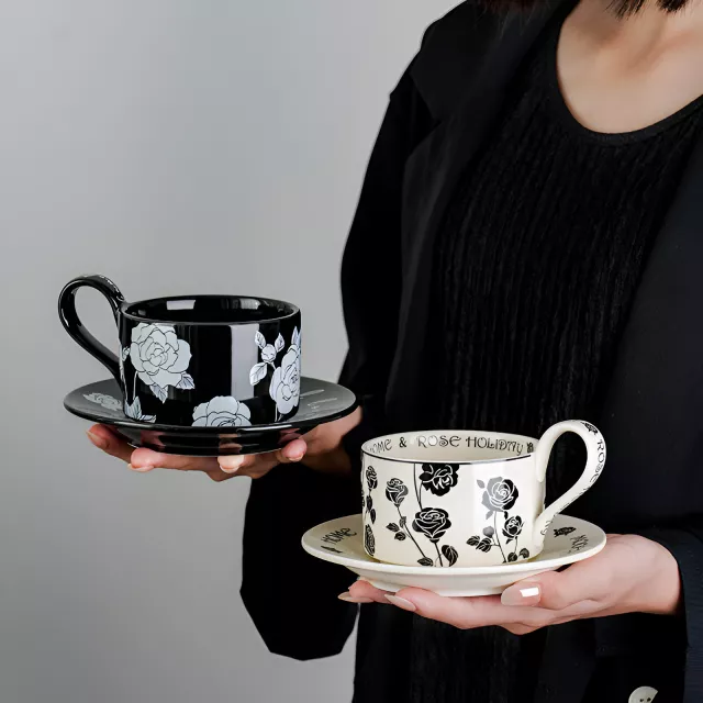 Black Rose Ceramic Latte Mug Set with Saucer – Vintage Home Coffee Cups